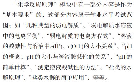需要指出的是,“化学1”、“化学2”二个模块中有一部分内容是作为“发展要求”的,这部分内容不属于学业水平考试范围;如“阿伏加德罗定律及其推论”、“常见离子化合物的形成过程”、“溴、碘”的提取与检验、“根据氧化还原反应判断物质的氧化性、还原性强弱”、“过氧化钠的主要性质”、“从铝土矿到铝合金”、“生产生活中的含氮化合物”,以及“简单共价分子的空间结构和键能”、“氢键”的相关知识、“离子晶体、分子晶体、原子晶体、金属晶体的主要特性”、“电解”相关知识、“乙醇在不同温度下的脱水反应”、“温室效应、光化学烟雾、酸雨、臭氧层空洞等产生的原因及对环境的危害”,等等。
